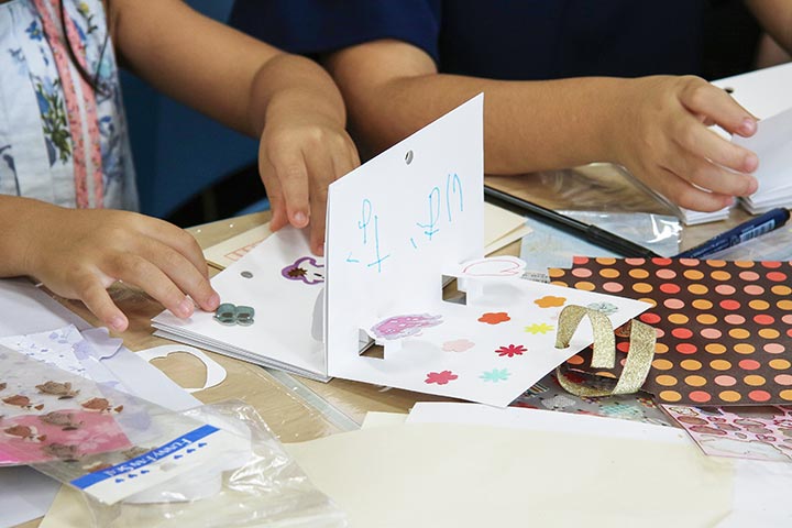 子供たちが2〜3時間も夢中になってカードを作っていた様子に驚きました。お母さんたちも席に座ってそばで安心して見ていられるので、学園祭やイベント会場にこうしたワークショップの場があると嬉しいです。
